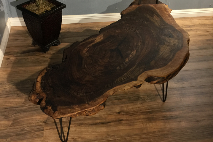 Varying live edge. 16” tall, Black metal hairpin style legs.