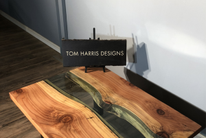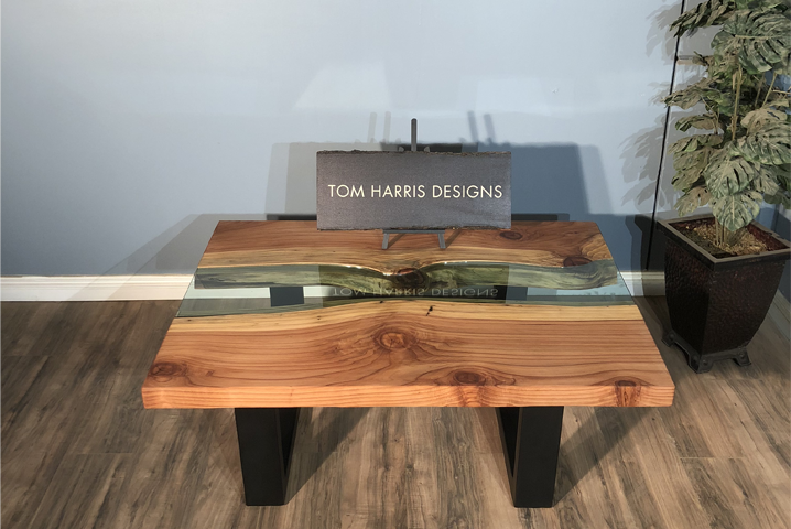 1/4” blue green tempered glass forming the river. Finished with Rubio Monocoat natural color oil/protectant.